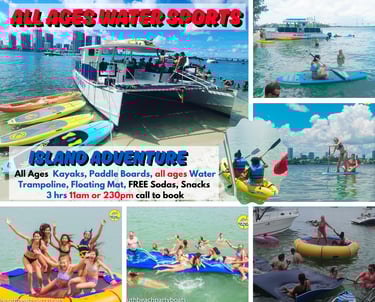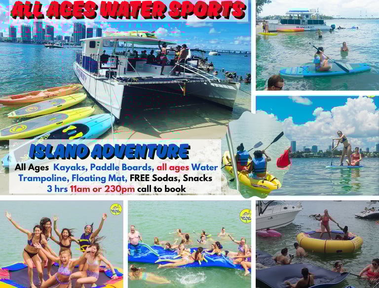 Kayaks, Trampoline, paddle boards, floats, included 25 Power catamaran speakers, 25 min cruise from Downtown Miami around Bayside Mansions to a tropical island with other boats, yachts, and jet skis, upon arrival guests adventure water toys is the best boat party in Miami. Bring your Favorite Drinks and smokes for an unforgettable experience. Starting @ $59.99