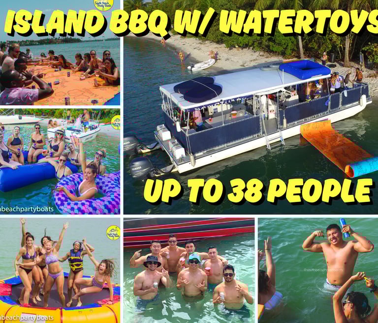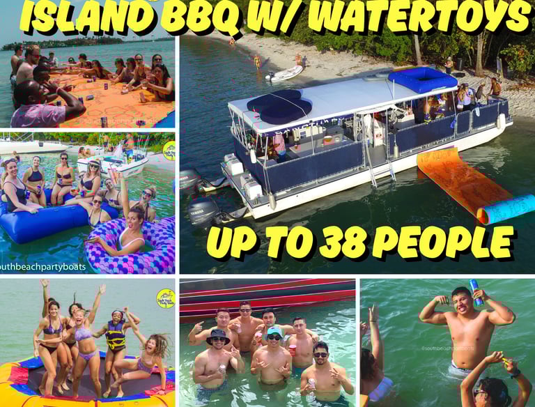 Trampoline, paddle boards, floats, included 38 Passenger party boats with DJ speakers, 25 min cruise from Downtown Miami around Bayside Mansions to a tropical island with other boats, yachts, and jet skis. Chicken Wings, fruit, veggies, and an afternoon of adventure water toys is the best boat party in Miami. Bring your Favorite Drinks and smokes for an unforgettable experience. Starting @ $59.99